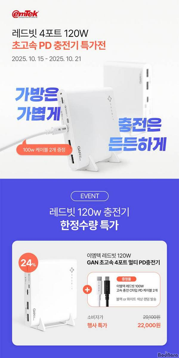 À̹ø Ư°¡ À̺¥Æ®´Â ÀÌ¿¥ÅØ ·¹µåºø 4Æ÷Æ® 120W PD ÃæÀü±â¿Í ÇÔ²² 100W °í¼Ó ÃæÀü CŸÀÔ PD ÄÉÀ̺í 2°³(ºí·¢&È­ÀÌÆ® ·£´ý »ö»ó)¸¦ 22,000¿ø¿¡ ±¸¸ÅÇÒ ¼ö ÀÖ´Â ÇÁ·Î¸ð¼ÇÀ¸·Î ÀÏÁÖÀÏ µ¿¾È ÁøÇàµÈ´Ù.