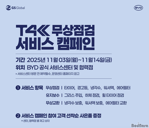 À̹ø ¹«»ó ¼ºñ½º Ä·ÆäÀÎÀº 11¿ù 3ÀÏ(¿ù)ºÎÅÍ 14ÀÏ(±Ý)±îÁö Àü±¹ BYD °ø½Ä ¼ºñ½º¼¾ÅÍ ¹× Çù·ÂÁ¡ ÃÑ 32°³¼Ò¿¡¼ ÁøÇàµÈ´Ù. °Ü¿ïö ±âº»Á¡°Ë 5°¡Áö ¹× À¯Áöº¸¼ö 3°¡Áö¸¦ Áß½ÉÀ¸·Î Â÷·® »óŸ¦ Á¡°ËÇϰí, ÀϺΠ¼Ò¸ðǰÀº ¹«»ó Áö¿øÇÑ´Ù.
