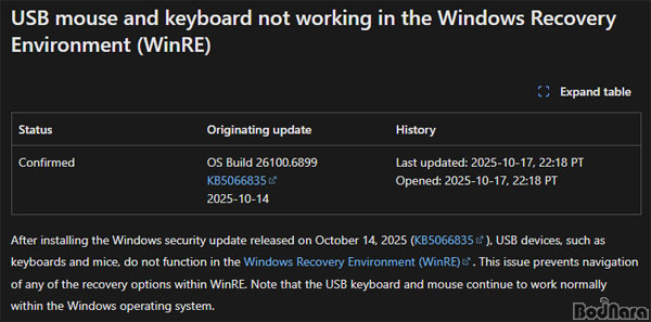 ÀÌ ¹®Á¦´Â º¹±¸ À̹ÌÁö ³»ºÎÀÇ USB ÀåÄ¡ µå¶óÀ̹ö ·Îµå °úÁ¤¿¡¼ ¿À·ù°¡ ¹ß»ýÇÑ ¶§¹®À¸·Î ÃßÁ¤ ÁßÀ̸ç, MS´Â ÇØ´ç ¹®Á¦¸¦ °ø½Ä È®ÀÎ(Confirmed) »óÅ·Πµî·ÏÇÏ°í ¼öÁ¤ ¾÷µ¥ÀÌÆ®¸¦ Áغñ ÁßÀÌ´Ù.