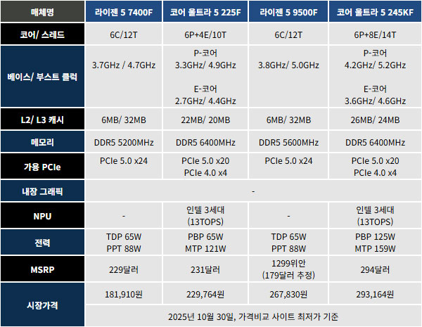°¡°Ý´ë¸¦ º¼ ¶§ ¶óÀÌÁ¨ 5 7400F¿Í ÄÚ¾î ¿ïÆ®¶ó 5 225F, ¶óÀÌÁ¨ 5 9500F¿Í