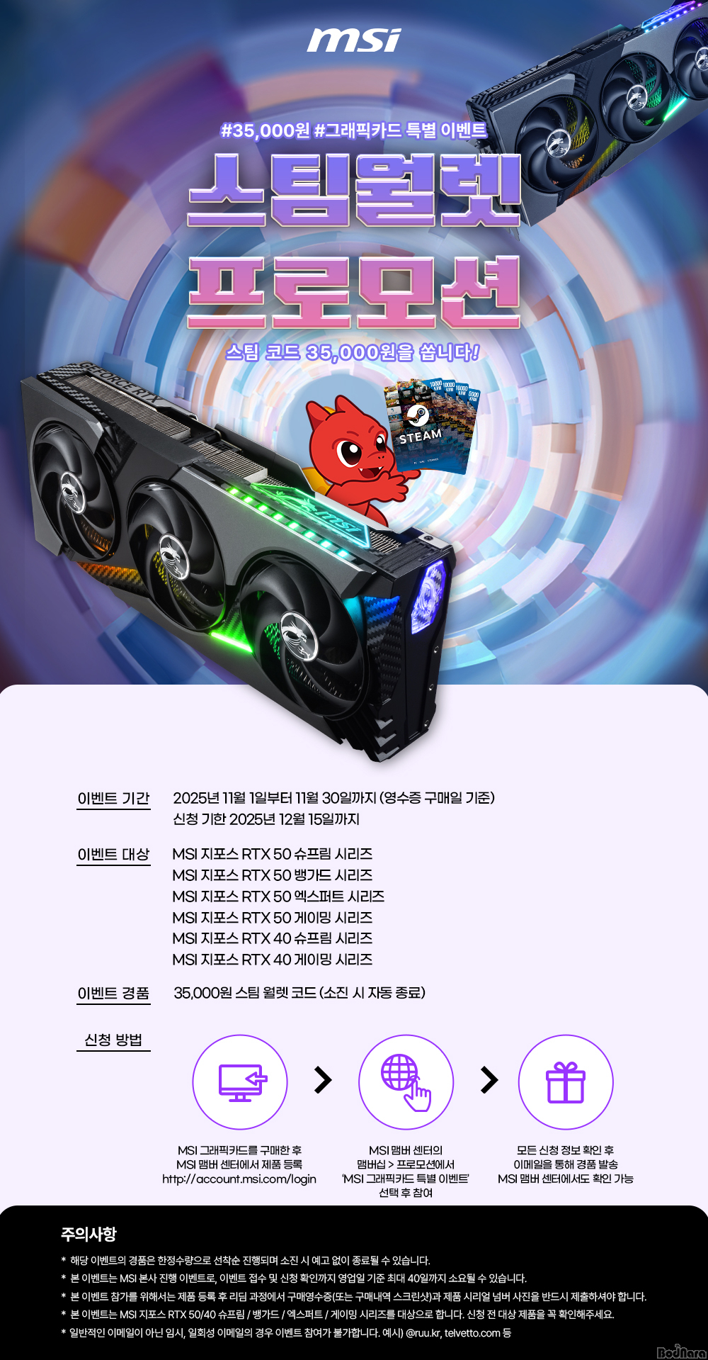À̹ø À̺¥Æ®´Â MSI ±×·¡ÇÈÄ«µå¸¦ ±¸¸ÅÇϰí Á¦Ç° µî·Ï ¹× À̺¥Æ® ½ÅûÀ» ¿Ï·áÇÑ °í°´¿¡°Ô ½ºÆÀ¿ù·¿ ÄÚµå 35,000¿ø±ÇÀ» ÁõÁ¤ÇÏ´Â ÇüÅ·ΠÁøÇàµÈ´Ù. 2025³â 11¿ù 1ÀϺÎÅÍ 11¿ù 30ÀϱîÁö ÇØ´ç Á¦Ç°±ºÀ» ±¸¸ÅÇÑ °í°´À̶ó¸é Âü¿©ÇÒ ¼ö ÀÖ´Ù.