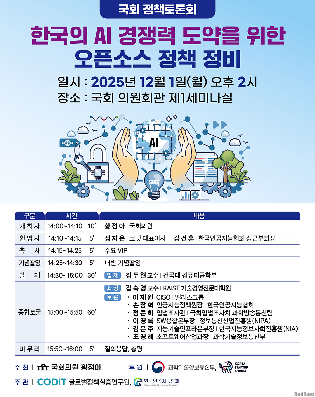 AI ¹ý·±ÔÁ¦·Á¤Ã¥ Ç÷§Æû ±â¾÷ ÄÚµ÷(CODIT, ´ëÇ¥ Á¤ÁöÀº) ºÎ¼³ ±Û·Î¹úÁ¤Ã¥½ÇÁõ¿¬±¸¿øÀº ¿À´Â 12¿ù 1ÀÏ(¿ù) ±¹È¸ ÀÇ¿øÈ¸°ü Á¦1¼¼¹Ì³ª½Ç¿¡¼ 'Çѱ¹ÀÇ AI °æÀï·Â µµ¾àÀ» À§ÇÑ ¿ÀǼҽº Á¤Ã¥ Á¤ºñ' ±¹È¸ Á¤Ã¥Åä·Ðȸ¸¦ °³ÃÖÇÑ´Ù. ÄÚµ÷ ±Û·Î¹úÁ¤Ã¥½ÇÁõ¿¬±¸¿ø°ú Çѱ¹ÀΰøÁö´ÉÇùȸ°¡ °øµ¿ ÁÖ°üÇϰí, °úÇбâ¼úÁ¤º¸Åë½ÅºÎ¿Í ÄÚ¸®¾Æ½ºÅ¸Æ®¾÷Æ÷·³ÀÌ ÈÄ¿øÇÏ´Â À̹ø Åä·Ðȸ´Â ¿ÀǼҽº AI°¡ ±¹°¡ Àü·«±â¼ú·Î ºÎ»óÇÏ´Â ±¹Á¦Àû È帧 ¼Ó¿¡¼ Çѱ¹ÀÇ Á¦µµÀû ±â¹ÝÀ» Á¡°ËÇÏ°í °³¼± ¹æÇâÀ» ¸ð»öÇϱâ À§ÇØ ¸¶·ÃµÆ´Ù.