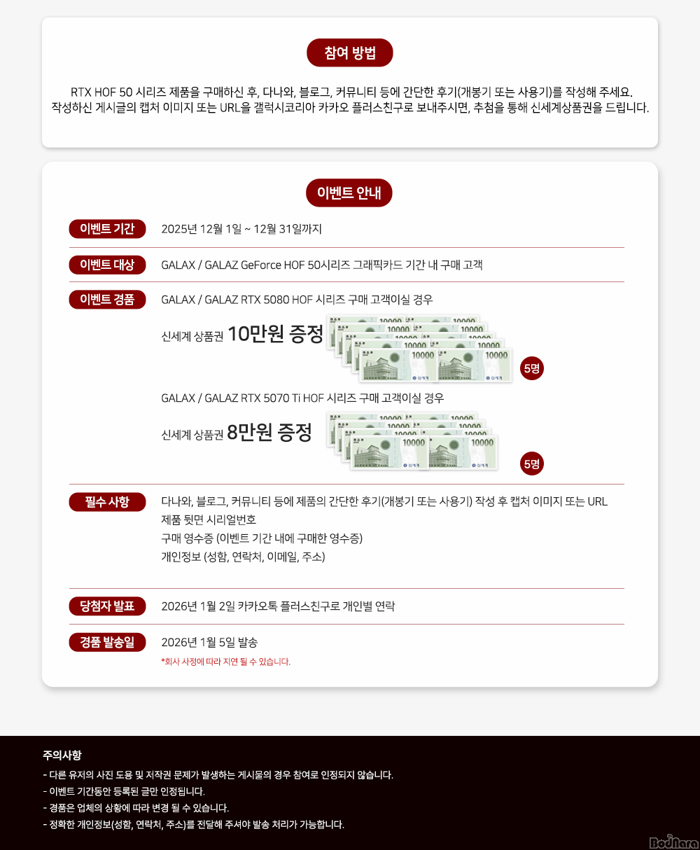 ±×·¡ÇÈÄ«µå Àü¹® Á¦Á¶±â¾÷ÀÎ °¶·°½Ã ¸¶ÀÌÅ©·Î½Ã½ºÅÛÁî(Galaxy Microsystems Ltd)ÀÇ Çѱ¹Áö»çÀÎ °¶·°½ÃÄÚ¸®¾Æ´Â 12¿ù ÇÑ ´Þ°£ GeForce RTX 5080 HOF ¹× RTX 5070 Ti HOF ½Ã¸®Áî ±¸¸Å °í°´À» ´ë»óÀ¸·Î Ãß÷À» ÅëÇØ ½Å¼¼°è »óǰ±ÇÀ» ÁõÁ¤ÇÏ´Â À̺¥Æ®¸¦ ÁøÇàÇÑ´Ù°í ¹àÇû´Ù.