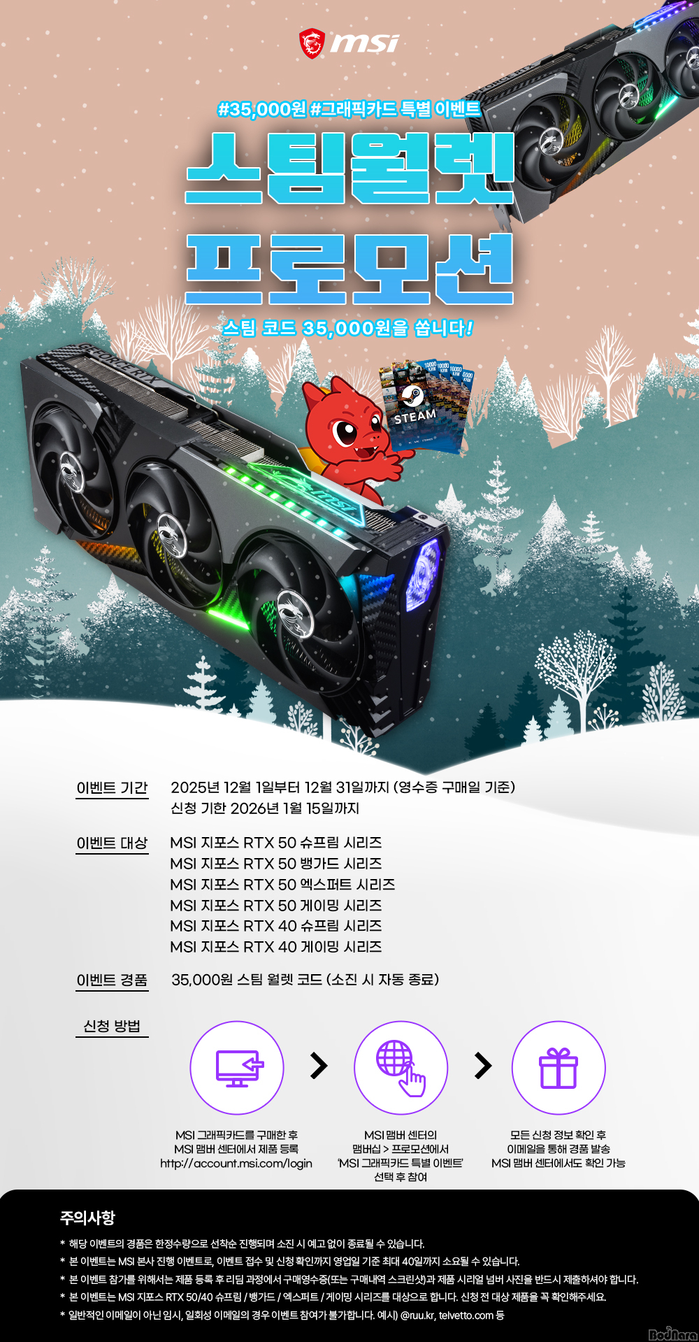 MSI ½ºÆÀ ¿ù·¿ ÇÁ·Î¸ð¼ÇÀº MSI ÁöÆ÷½º ±×·¡ÇÈÄ«µå ±¸¸Å °í°´¿¡°Ô °¨»çÀÇ ¸¶À½À» ÀüÇϰí, MSIÀÇ °·ÂÇÑ ±×·¡ÇÈÄ«µå ¼º´É°ú ÃÖ°íÀÇ °ÔÀÌ¹Ö Ç÷§Æû ½ºÆÀ(STEAM)¿¡¼ ÃÖ°íÀÇ °ÔÀÌ¹Ö ¶óÀÌÇÁ¸¦ Áñ±æ ¼ö ÀÖµµ·Ï Áö¿øÇϱâ À§ÇØ ±âȹµÇ¾ú´Ù. ÇÁ·Î¸ð¼Ç ½Åû ±âÇÑÀº 2026³â 1¿ù 15ÀϱîÁöÀ̸ç, ½ÅûÀÌ ¿Ï·áµÇ¸é ´ã´çÀÚÀÇ È®ÀÎÀ» °ÅÃÄ ½ºÆÀ ¿ù·¿ Äڵ尡 À̸ÞÀÏ·Î ¹ß¼ÛµÈ´Ù. ÁõÁ¤µÇ´Â Äڵ带 ½ºÆÀ °èÁ¤¿¡ µî·ÏÇϸé Áï½Ã 35,000¿øÀ» ÃæÀüÇÏ¿© ÃֽаÔÀÓ ±¸¸Å µî¿¡ ÀÚÀ¯·Ó°Ô »ç¿ëÇÒ ¼ö ÀÖ´Ù.