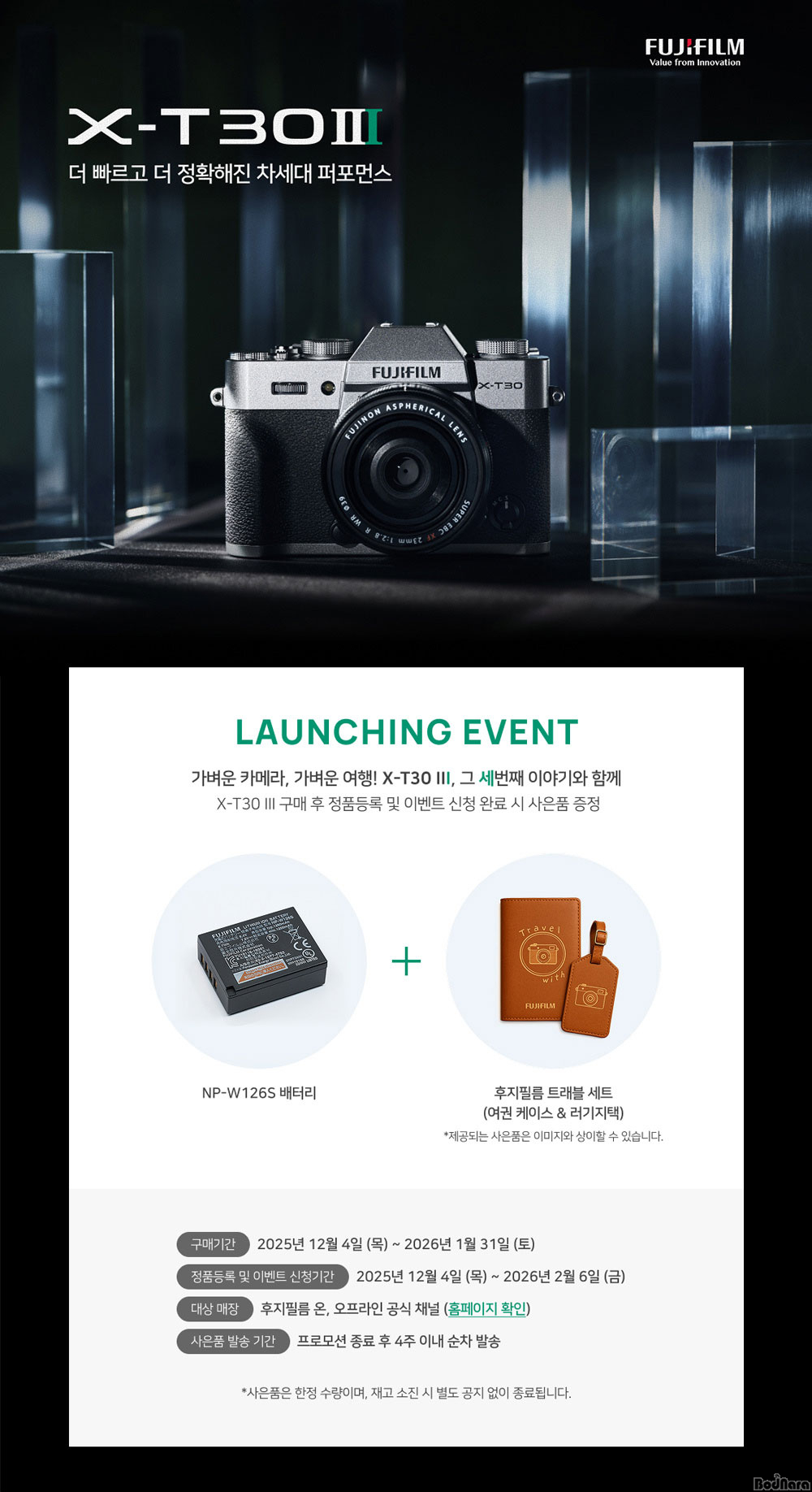 ÈÄÁöÇʸ§ ÄÚ¸®¾Æ´Â ³»³â 1¿ù 31ÀϱîÁö X-T30 III ±¸¸Å ÈÄ 2¿ù 6ÀϱîÁö Á¤Ç° µî·Ï ¹× À̺¥Æ® ½ÅûÀ» ¿Ï·áÇÑ °í°´µéÀ» ´ë»óÀ¸·Î Á¤Ç° ¹èÅ͸®(NP-W126S)¿Í ÇÔ²² ¿©±Ç ÄÉÀ̽º, ·¯±âÁöÅÃÀ¸·Î ±¸¼ºµÈ Æ®·¡ºí ¼¼Æ®¸¦ ÁõÁ¤ÇÑ´Ù. »çÀºÇ°Àº ÇÑÁ¤ ¼ö·®À¸·Î ¼±Âø¼ø Á¦°øµÇ¸ç ÇÁ·Î¸ð¼Ç Á¾·á ÈÄ 4ÁÖ À̳»¿¡ ¼øÂ÷ ¹ß¼Û ¿¹Á¤ÀÌ´Ù.