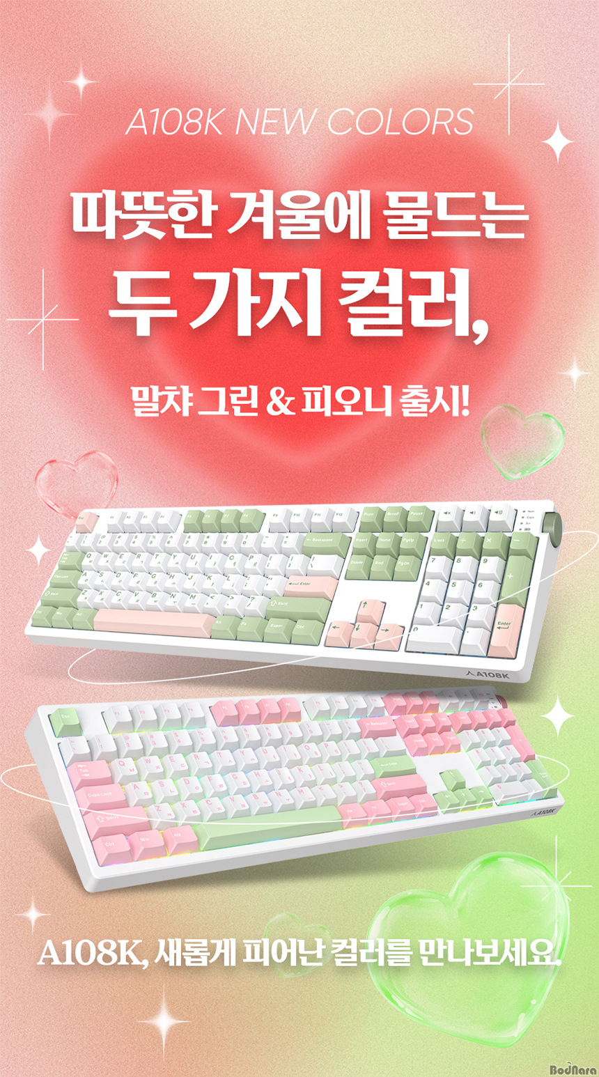 A108K´Â ±â´É, µðÀÚÀÎ, ÆíÀǼºÀ» °í·ç °®Ãá ¾ÛÄÚÀÇ ½ºÅ׵𼿷¯ Ç®¹è¿­ Űº¸µå·Î, À̹ø Ä÷¯ Ãß°¡¸¦ ÅëÇØ ¶óÀξ÷À» ÇÑÃþ °­È­Çß´Ù. À̹ø¿¡ »õ·Ó°Ô Ãß°¡µÈ ‘ÇÇ¿Àµð’ Ä÷¯´Â ÀºÀºÇÑ ÇÎÅ© ÅæÀÇ Å°Ä¸ Á¶ÇÕÀ¸·Î ¸ùȯÀûÀÌ°í °¨°¢ÀûÀÎ ºÐÀ§±â¸¦ ÀھƳ»¸ç, ‘¸»Ã­±×¸°’Àº ¾ÆÀ̺¸¸® ¹Ùµð¿¡ »ê¶æÇÑ ±×¸° Ä÷¯ ŰĸÀ» Á¶ÇÕÇØ Æí¾ÈÇÑ ¹«µå¸¦ ÀھƳ»¸ç ¿¬¸» ½ÃÁðÀÇ µû¶æÇÑ ºÐÀ§±â¿Íµµ Àß ¾î¿ï¸®´Â °¨¼º Ä÷¯·Î ÁÖ¸ñ¹Þ°í ÀÖ´Ù.