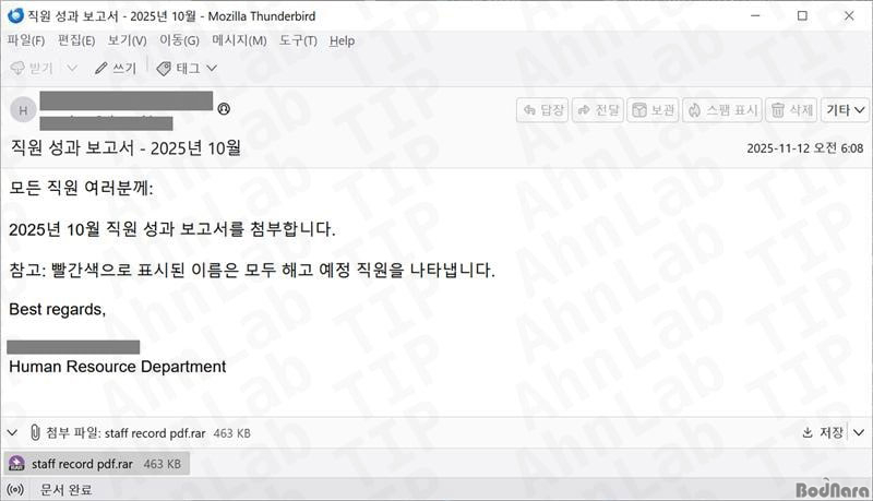 °ø°ÝÀÚ´Â ¸ÞÀÏ¿¡ ‘Á÷¿ø ±â·Ï pdf(staff record pdf)’¶ó´Â À̸§ÀÇ Ã·ºÎÆÄÀÏÀ» Æ÷ÇÔ½ÃÄÑ, ½ÇÁ¦ È®ÀåÀÚÀÎ ‘.rar’¸¦ ¼û±ä ä ÀÏ¹Ý PDF ¹®¼ ÆÄÀÏ·Î ¿ÀÀÎÇϵµ·Ï À§ÀåÇß´Ù. »ç¿ëÀÚ°¡ ÇØ´ç ÷ºÎÆÄÀÏÀ» ¿¸é ¾ÐÃà ÆÄÀÏÀÌ ´Ù¿î·ÎµåµÇ¸ç, ¾ÐÃà ÆÄÀÏ ³»ºÎ¿¡´Â ½ÇÇà ÆÄÀÏ(.exe)ÀÌ Æ÷ÇԵŠÀÖ´Ù. À̸¦ ½ÇÇàÇÒ °æ¿ì PC È¸é ¹× Å° ÀÔ·Â ¼öÁý, À¥Ä··¸¶ÀÌÅ© Á¢±Ù, À¥ ºê¶ó¿ìÀú ÀúÀå Á¤º¸ Å»Ãë µî ´Ù¾çÇÑ ¾Ç¼º ÇàÀ§¸¦ ¼öÇàÇÏ´Â ¿ø°Ý Á¦¾î ¾Ç¼ºÄڵ尡 µ¿ÀÛÇÑ´Ù.