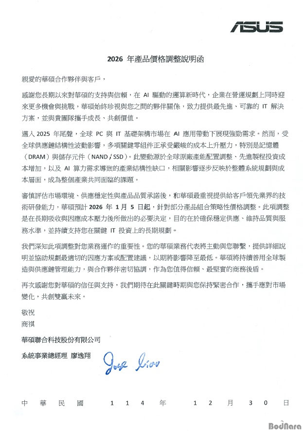 ASUS°¡ 2026³â 1¿ù 5ÀϺÎÅÍ ÀϺΠÁ¦Ç°¿¡ ´ëÇØ °¡°Ý ÀλóÀ» ´ÜÇàÇÑ´Ù°í °øÁöÇß´Ù.