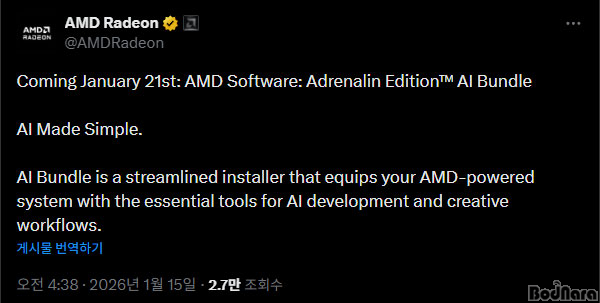 2026³â µé¾î óÀ½ ¹èÆ÷µÇ´Â AMD ¼ÒÇÁÆ®¿þ¾î ¾Æµå·¹³¯¸° ¿¡µð¼Ç 26.1.1 ¹öÀüÀº 'AI Bundle'À̶ó´Â ºÎÀ縦 ´Þ°í ³ª¿À´Â ¸¸Å, AMD ½Ã½ºÅÛ »ç¿ëÀÚµéÀÌ AI °³¹ß ¹× ¿öÅ©Ç÷ο츦 À§ÇÑ ±âº» ÅøÀ» ¼Õ½±°Ô ¼³Ä¡ÇÒ ¼ö ÀÖµµ·Ï Áö¿øÇÒ ¿¹Á¤ÀÌ´Ù.