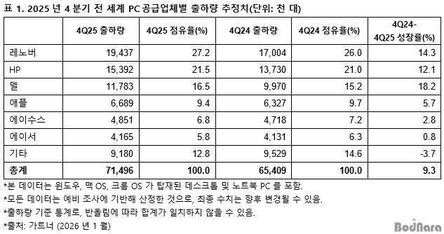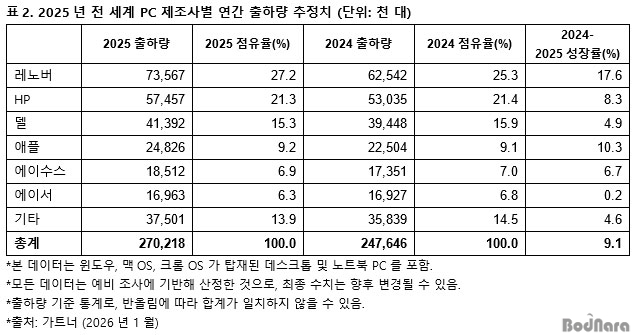 2025³â 4ºÐ±â ±âÁØ Àü ¼¼°è »óÀ§ 6°³ PC Á¦Á¶»çÀÇ ¼øÀ§¿¡´Â Å« º¯È°¡ ¾ø¾úÀ¸¸ç, ·¹³ë¹ö, HP, µ¨ µî »óÀ§ 3°³ ¾÷ü´Â Àü³â µ¿±â ´ëºñ ½ÃÀå Á¡À¯À²À» È®´ëÇß´Ù.