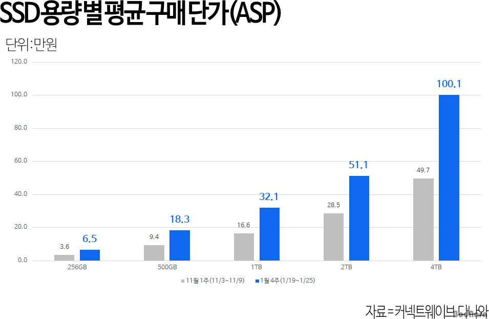 ¶Ç ¼ö¿ä°¡ °¡Àå ¸¹Àº 1TB SSDÀÇ Æò±Õ ±¸¸Å°¡´Â 11¿ù 1ÁÖÂ÷ 16.6¸¸ ¿ø¿¡¼ 1¿ù 4ÁÖÂ÷ 32.1¸¸ ¿øÀ¸·Î ¿Ã¶úÀ¸¸ç, 2TB SSD ¿ª½Ã °°Àº ±â°£ 28.5¸¸ ¿ø¿¡¼ 51.1¸¸ ¿øÀ¸·Î »ó½ÂÇß´Ù. 500GB SSD¿Í 256GB SSD ¶ÇÇÑ °¢°¢ 18.3¸¸ ¿ø°ú 6.5¸¸ ¿øÀ» ±â·ÏÇϸç 11¿ù ´ëºñ ¿À¸§¼¼¸¦ À¯ÁöÇß´Ù.