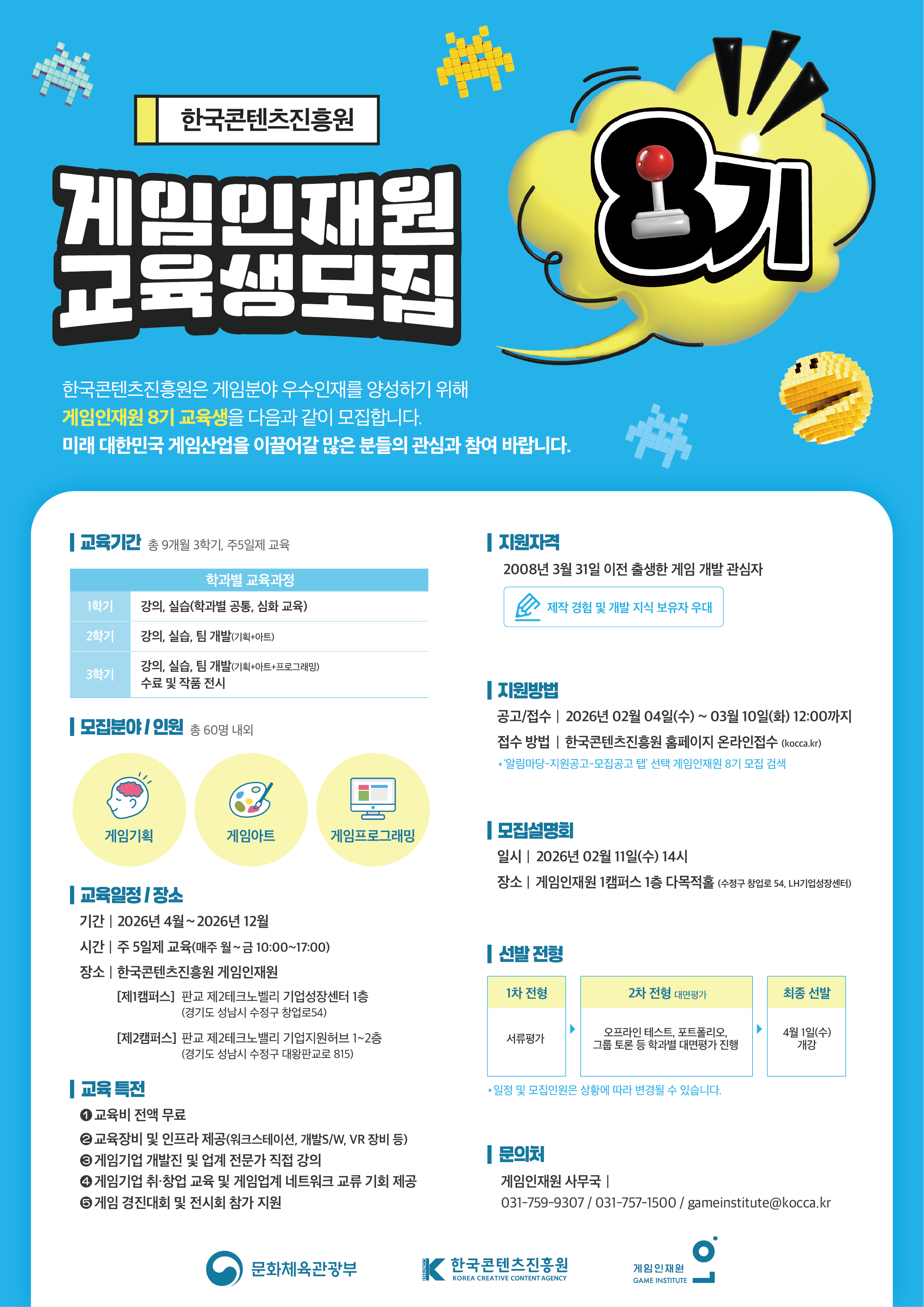 ¸ðÁý ºÐ¾ß´Â ¡ã°ÔÀÓ±âȹ ¡ã°ÔÀÓ¾ÆÆ® ¡ã°ÔÀÓÇÁ·Î±×·¡¹Ö µî 3°³ ÇаúÀ̸ç, °¢ Çаúº° 20¸í ³»¿Ü, ÃÑ 60¸í ±Ô¸ðÀÇ ±³À°»ýÀ» ¼±¹ßÇÒ ¿¹Á¤ÀÌ´Ù. ƯÈ÷ À̹ø 8±â °úÁ¤¿¡¼´Â Àεð °ÔÀÓ µðÀÚÀÎ, ÀΰøÁö´É(AI), ÀΰøÁö´É(AI) ¾ÆÆ®, ÀΰøÁö´É(AI) ¸®ÅÍ·¯½Ã µî ÃֽаÔÀÓ °³¹ß ¹× ±â¼ú Æ®·»µå¸¦ ¹Ý¿µÇÑ ±³À° ÄÜÅÙÃ÷¸¦ °ÈÇØ ºü¸£°Ô º¯ÈÇÏ´Â °ÔÀÓ »ê¾÷ ȯ°æ¿¡ ´Éµ¿ÀûÀ¸·Î ´ëÀÀÇÒ ¼ö ÀÖ´Â ÀÎÀç ¾ç¼º¿¡ ÁýÁßÇÑ´Ù.