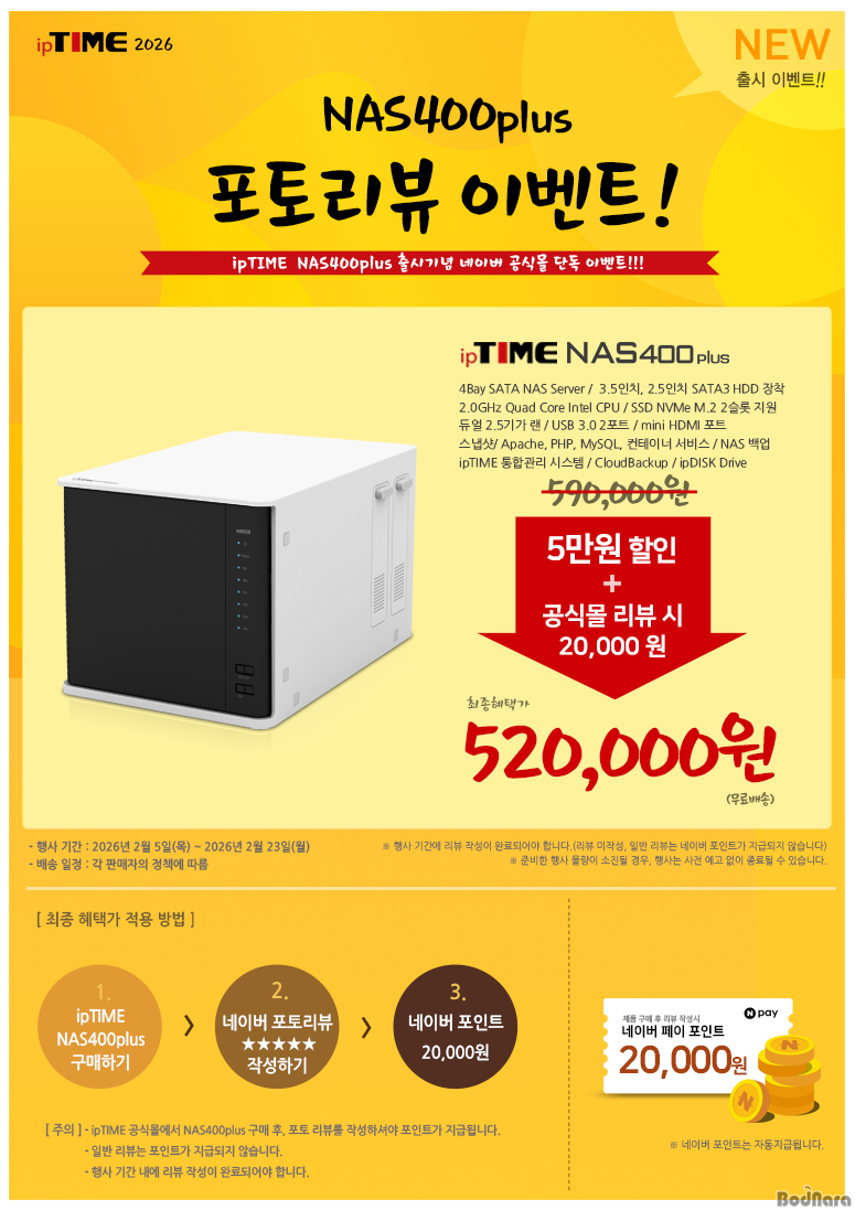 ipTIME NAS400plus Ãâ½Ã¸¦ ±â³äÇÏ¿© 2¿ù 23ÀϱîÁö Á¤°¡ ´ëºñ 5¸¸ ¿ø ÇÒÀÎµÈ 540,000¿ø¿¡ ±¸¸ÅÇÒ ¼ö Àִ Ư°¡ ÇÁ·Î¸ð¼ÇÀÌ ÁøÇàµÇ¸ç, ipTIME °ø½Ä ½º¸¶Æ®½ºÅä¾î ±¸¸Å °í°´À» ´ë»óÀ¸·Î Æ÷Åä ¸®ºä ÀÛ¼º ½Ã 2¸¸¿øÀÇ ³×À̹ö Æ÷ÀÎÆ®¸¦ Áö±ÞÇÏ´Â À̺¥Æ®µµ ÇÔ²² ÁøÇàµÇ¾î ÃÖÁ¾ ü°¨ ±¸¸Å°¡´Â 520,000¿øÀÌ´Ù.
