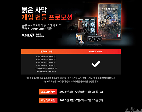 °ÔÀÓ ¹øµé ÇÁ·Î¸ð¼ÇÀÇ Âü¿© ¹æ¹ýÀº, 2026³â 02¿ù 10ÀÏ ¿ÀÈÄ 11½Ã ÀÌÈÄ Á¦Ç° ±¸¸Å ÈÄ ÇÁ·Î¸ð¼Ç Á¢¼ö ÆäÀÌÁö (Çà»ç ÆäÀÌÁöÀÇ QRÄÚµå)¿¡ Á¢¼ÓÇØ Á¦Ç° Á¤º¸¿Í ¿µ¼öÁõ À̹ÌÁö µîÀ» ¾÷·ÎµåÇÏ¸é ³»¿ë È®ÀÎ ÈÄ ºÓÀº»ç¸·(Crimson Desert) °ÔÀÓ ÄÚµå ½ºÅ©·¹Ä¡ Áö·ù¸¦ ¿ìÆíÀ¸·Î ¹ß¼Û µÇ¸ç, AMD¸®¿öµå »çÀÌÆ®¸¦ ÅëÇØ °ÔÀÓ ¸®µõ ÀýÂ÷°¡ ¿Ï·áµÈ´Ù.
