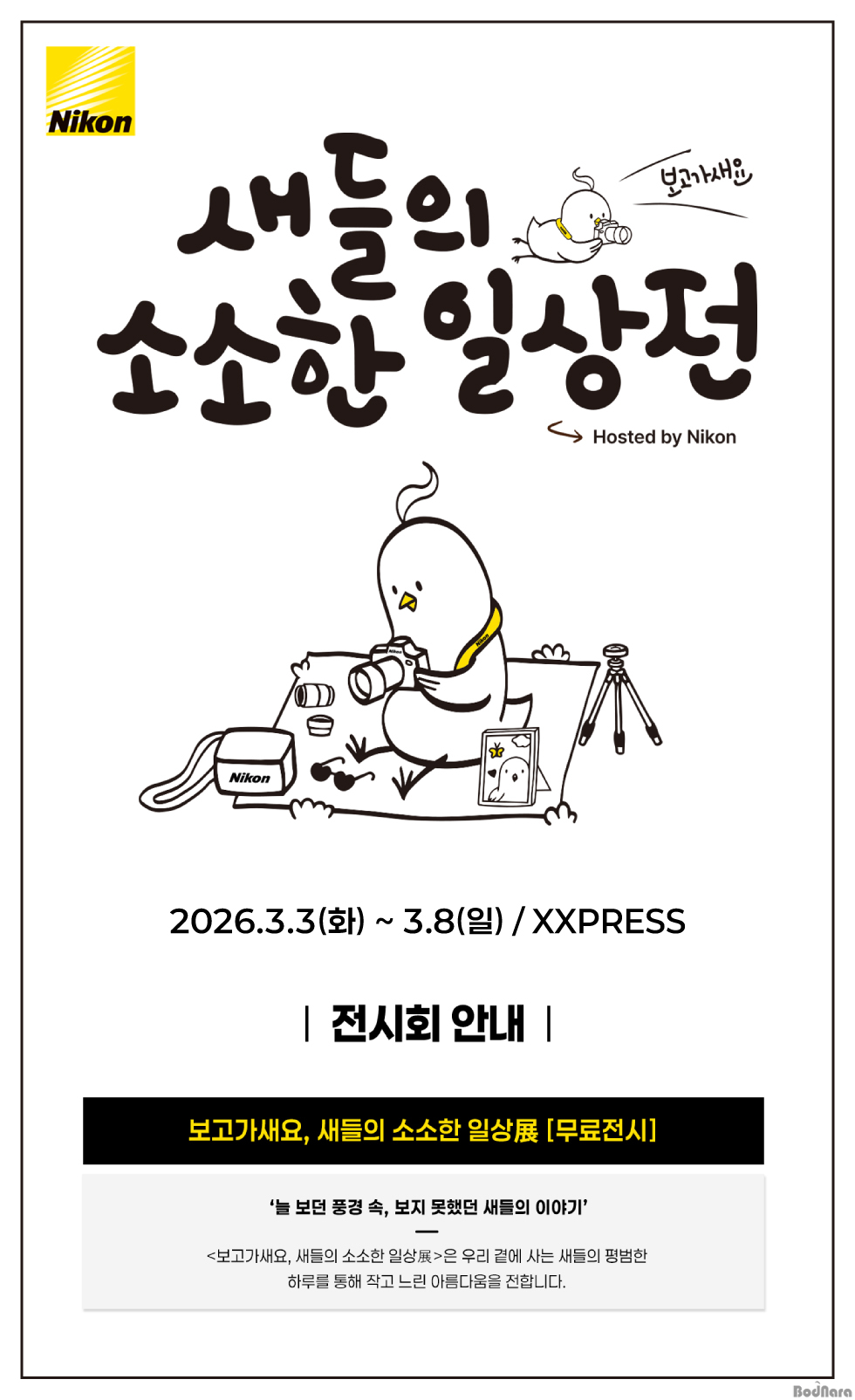 ‘»õµéÀÇ ¼Ò¼ÒÇÑ ÀÏ»óÀü’Àº ¿ì¸® ÁÖº¯¿¡¼ ½±°Ô ¸¸³¯ ¼ö ÀÖ´Â »õµéÀÇ Æò¹üÇÑ ÇϷ縦 »çÁøÀ¸·Î ´ã¾Æ³½ Àü½Ã·Î, ÀÚ¿¬°ú »ýÅ¿¡ ´ëÇÑ °ü½É°ú ±³°¨À» ³ª´©±â À§ÇØ ±âȹµÆ´Ù. À̹ø Àü½Ã¿¡¼´Â Áö³ÇØ ÁøÇàµÈ ´ÏÄÜ Á¶·ù Æ÷Åä ÄÜÅ×½ºÆ® ÀÔ»óÀÛÀ» ºñ·ÔÇØ Ŭ·´ N ¼Ò¼Ó ÀÛ°¡µé°ú Á¶·ù »çÁø ºÐ¾ß¿¡¼ Ȱµ¿ ÁßÀÎ »çÁø°¡µéÀÇ ÀÛǰÀÌ Àü½ÃµÈ´Ù.