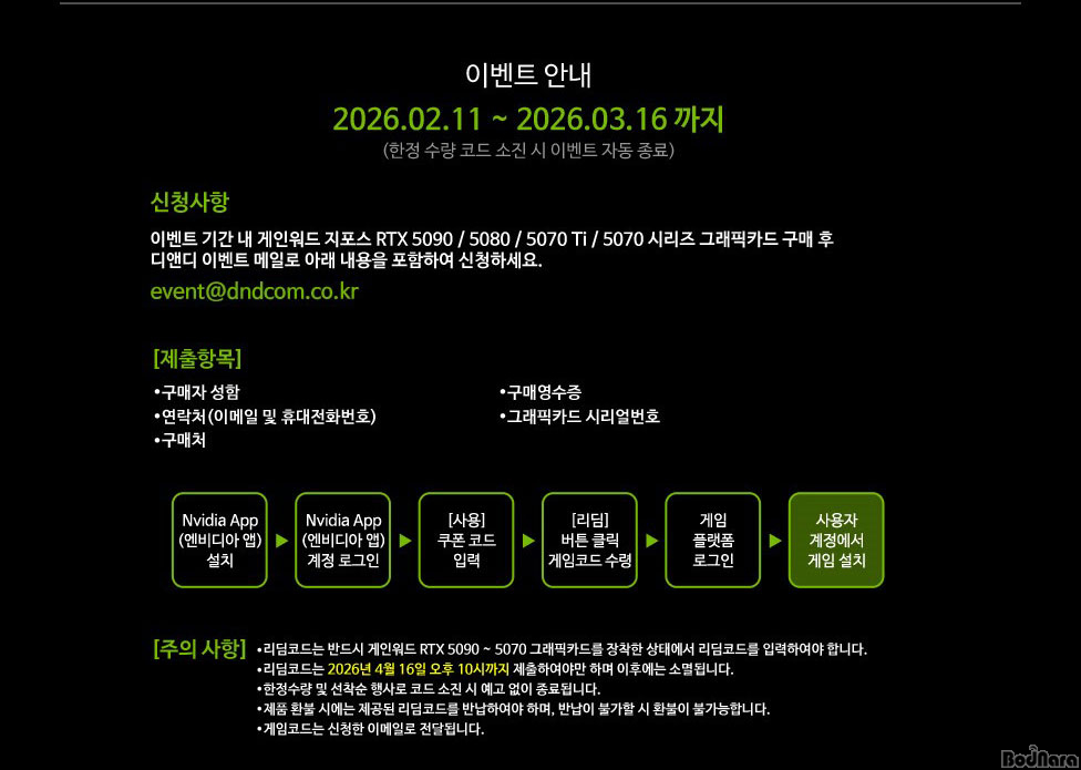 À̹ø °ÔÀÓ ¹øµé ÇÁ·Î¸ð¼ÇÀÇ Âü¿© ¹æ¹ýÀº, 2026³â 2¿ù 10ÀÏ ¿ÀÈÄ 10½Ã ÀÌÈÄ Á¦Ç° ±¸¸Å ÈÄ µð¾ØµðÄÄ À̺¥Æ® ¸ÞÀÏ(event@dndcom.co.kr)·Î Á¦Ç°¿¡ °üÇÑ Á¤º¸ ¹× ÀÎÀû »çÇ×À» µî·ÏÇϸé ÇÁ·Î¸ð¼Ç ÁøÇà ´ã´çÀÚ°¡ È®ÀÎ ÈÄ, °í°´¿¡°Ô ‘¹ÙÀÌ¿ÀÇÏÀÚµå ·¹Äû¿¥’ °ÔÀÓ Äڵ带 À̸ÞÀÏ·Î ¹ß¼ÛÇϸç, °í°´Àº NVIDIA APPÀ» ÅëÇØ ¸®µõ Äڵ带 µî·ÏÇÏ¸é °ÔÀÓ µî·Ï ÀýÂ÷´Â ¿Ï·áµÈ´Ù.
