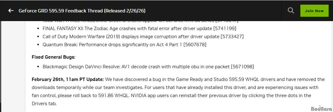 ÇÑÆí, ÁöÆ÷½º °ÔÀÓ ·¹µð µå¶óÀ̹ö 595.59 ¹öÀüÀº ±×·¡ÇÈ Ä«µå¿¡¼ ÆÒ Á¦¾î ¹× ¸ð´ÏÅ͸µ, ¼º´É ¹®Á¦°¡ º¸°íµÇ¾î ´Ù¿î·Îµå°¡ ÁߴܵǾú´Ù. ÀϺΠÆÒÀÌ µ¿ÀÛÇÏÁö ¾Ê°Å³ª, »ç¿ëÀÚ ÁöÁ¤ ÆÒ °î¼±ÀÌ ¹«½ÃµÇ´Â µîÀÇ ¹®Á¦°¡ ¹ß»ýÇÏ¿´°í, GPU Àü¾Ð Á¦ÇÑ Çö»óÀ¸·Î ºÎ½ºÆ® Ŭ·° Ç϶ô¿¡ ÀÇÇÑ ¼º´É ÀúÇÏ ¹®Á¦µµ º¸°í µÇ¾ú´Ù.