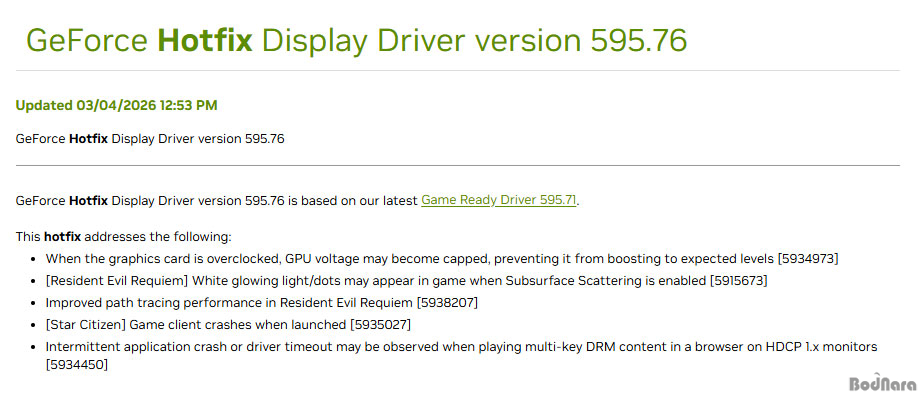 ¿£ºñµð¾Æ´Â ÇØ´ç ¹®Á¦¸¦ ÇØ°áÇϱâ À§ÇØ ÁöÆ÷½º ÇÖÇȽº µå¶óÀ̹ö 595.76À» ¹èÆ÷Çß´Ù. À̹ø ÇÖÇȽº´Â ¹Ù·Î Á÷Àü ¹èÆ÷µÈ °ÔÀÓ ·¹µð µå¶óÀ̹ö 595.71À» ±â¹ÝÀ¸·Î Çϸç, ±×·¡ÇÈÄ«µå ¿À¹öŬ·° ½Ã GPU Àü¾ÐÀÌ Á¦ÇѵǾî Á¤»óÀûÀÎ ºÎ½ºÆ® Ŭ·°¿¡ µµ´ÞÇÏÁö ¸øÇÏ´Â ¹®Á¦¸¦ ¼öÁ¤ÇÏ´Â °ÍÀÌ ÇÙ½ÉÀÌ´Ù.