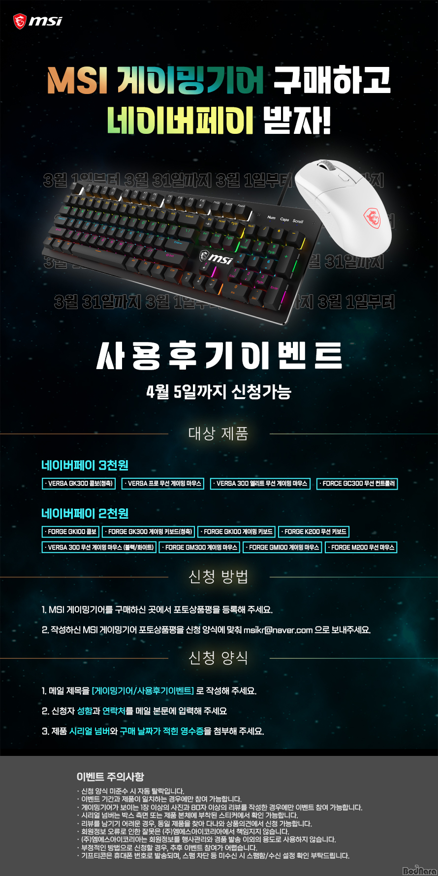 À̹ø ÇÁ·Î¸ð¼ÇÀº 3¿ù MSI °ÔÀֱ̹â¾î ÁÖ¿ä Á¦Ç° ±¸¸Å °í°´À» ´ë»óÀ¸·Î Çϸç, Á¦Ç° ±¸¸Å ÈÄ »ç¿ë Èı⸦ ÀÛ¼ºÇÑ °í°´¿¡°Ô ³×À̹öÆäÀÌ Æ÷ÀÎÆ®¸¦ ÁõÁ¤ÇÑ´Ù. °æÇ°Àº Á¦Ç°¿¡ µû¶ó 2,000¿ø ¶Ç´Â 3,000¿ø »ó´çÀ¸·Î ±¸¼ºµÇ¸ç, ¼±Âø¼ø ÇÑÁ¤ ¼ö·®À¸·Î Á¦°øµÈ´Ù.