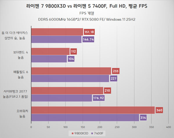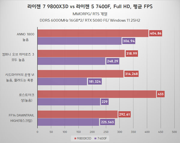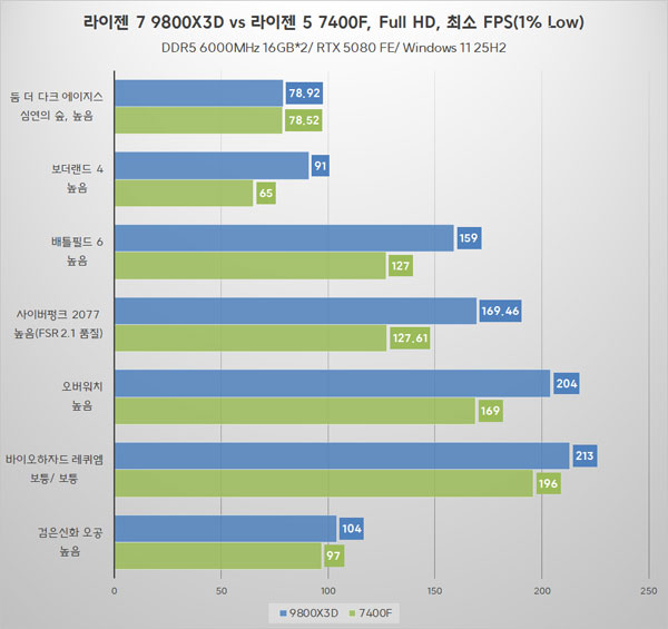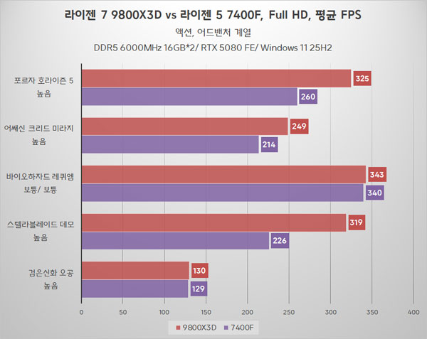 Æò±Õ ÇÁ·¹ÀÓ ±âÁØ, ¶óÀÌÁ¨ 7 9800X3D°¡ ´ëºÎºÐÀÇ °ÔÀÓ¿¡¼ ¶óÀÌÁ¨ 5 7400Fº¸´Ù