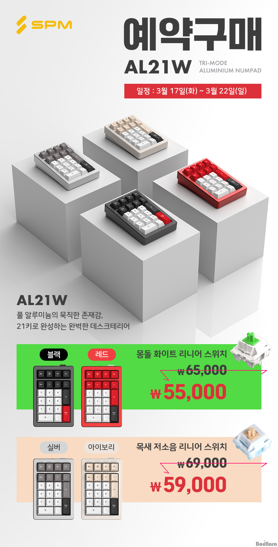 ¿¹¾à ±¸¸Å´Â 3¿ù 17ÀÏ(È)ºÎÅÍ 3¿ù 22ÀÏ(ÀÏ) 23½Ã 59ºÐ±îÁö SPM ´ë¸®Á¡ ÅÍÄ¡Ç÷¡´Ö, Á¦Æ®Æ÷ÀÎÆ® ½º¸¶Æ®½ºÅä¾î¿¡¼ ÁøÇàµÈ´Ù. Çà»ç ±â°£ µ¿¾È AL21W ¸ñ»õ´Â Á¤»ó°¡ 69,000¿ø¿¡¼ ÇÒÀÎµÈ 59,000¿ø¿¡, AL21W ¸ùµ¹Àº Á¤»ó°¡ 65,000¿ø¿¡¼ ÇÒÀÎµÈ 55,000¿ø¿¡ ±¸¸ÅÇÒ ¼ö ÀÖ´Ù.