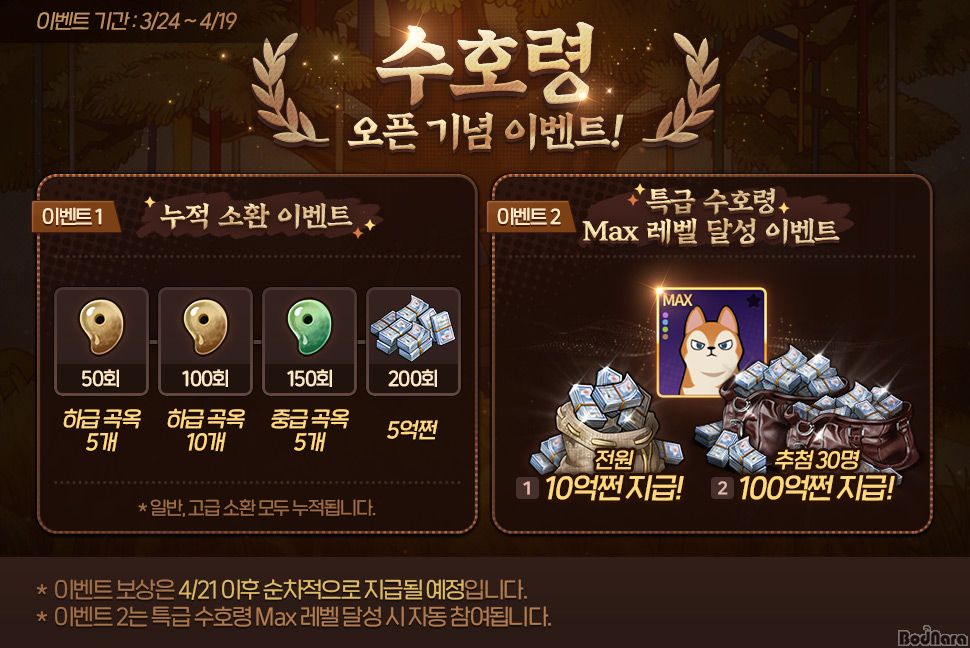 ‘ÇѰÔÀÓ ¼¸´Ù&¸Â°í’´Â À̹ø ¾÷µ¥ÀÌÆ®¸¦ ±â³äÇØ ¿À´Â 4¿ù 19ÀϱîÁö dz¼ºÇÑ ÇýÅÃÀ» ´ãÀº 2Á¾ÀÇ À̺¥Æ®¸¦ ÁøÇàÇÑ´Ù. ¸ÕÀú ‘¼öÈ£·É ´©Àû ¼Òȯ À̺¥Æ®’¸¦ ÅëÇØ ¼Òȯ Ƚ¼ö¿¡ µû¶ó ¼ºÀå¿¡ ÇÊ¿äÇÑ °î¿Á ¹× ¾ Àçȸ¦ È®Á¤ Áö±ÞÇÑ´Ù. ¶ÇÇÑ, ‘Ư±Þ ¼öÈ£·É’ÀÇ ÃÖ°í ·¹º§(MAX)À» ´Þ¼ºÇÑ ¸ðµç ÀÌ¿ëÀÚ¿¡°Ô´Â 10¾ï ¾À» Áö±ÞÇϸç, ÀÌ Áß Ãß÷À» ÅëÇØ ¼±Á¤µÈ 30¸í¿¡°Ô´Â °¢°¢ 100¾ï ¾À̶ó´Â ÆÄ°ÝÀûÀÎ º¸»óÀ» Á¦°øÇÒ ¿¹Á¤ÀÌ´Ù.