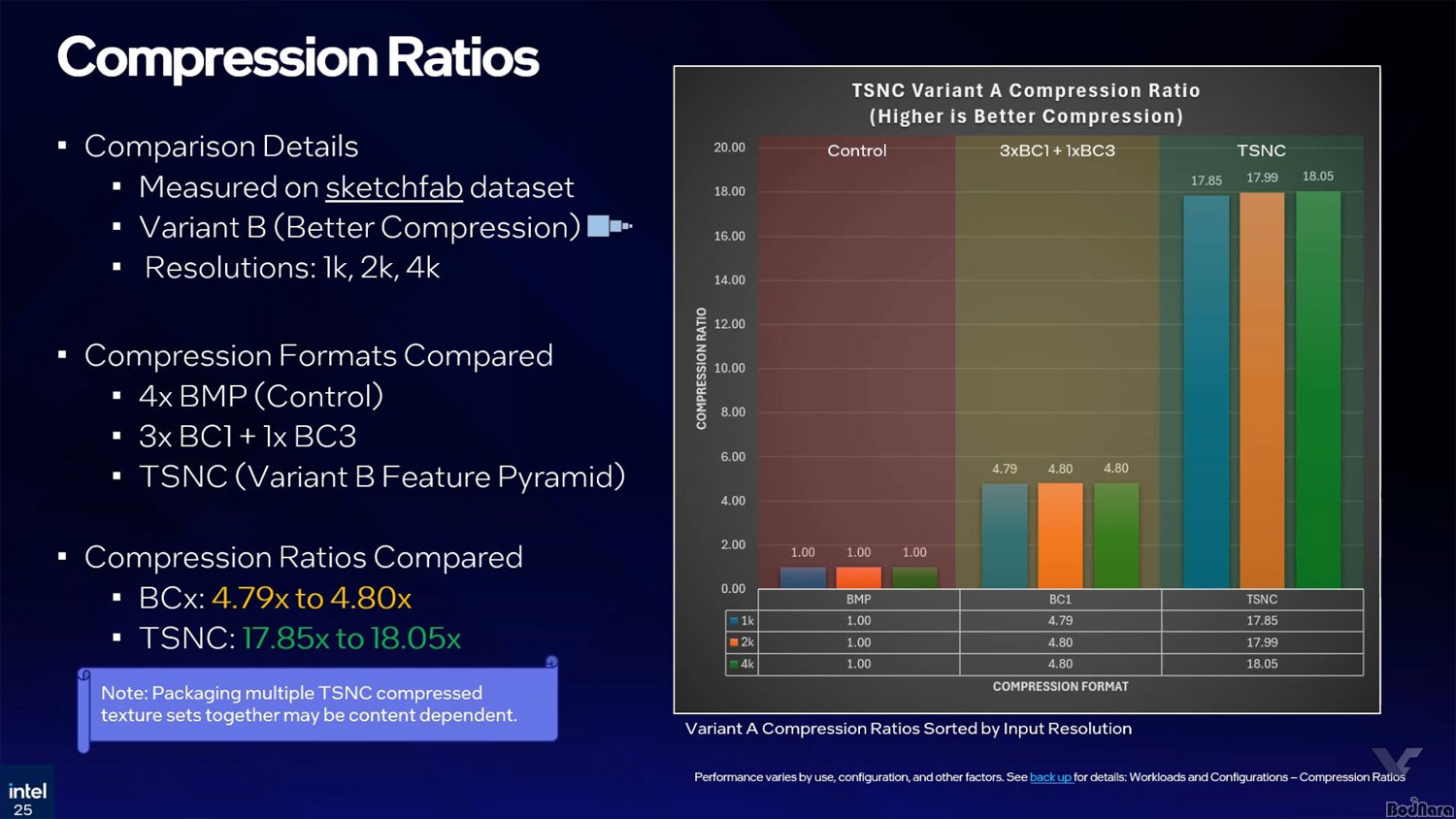 TSNC´Â ǰÁú Á߽à ¸ðµå(variant A)¿Í ¼º´É Á߽à ¸ðµå(variant B)°¡ Á¦°øµÇ¸ç, ÃÑ ³×°¡Áö ÅØ½ºÃ³ ¾ÐÃà ¹æ½ÄÀÌ ¼Ò°³µÇ¾ú´Ù. ǰÁú Á߽øðµå´Â 4096x4096 64MB ÅØ½ºÃ³¸¦ ÇØ»óµµ À¯ÁöÇÏ¸é¼ 10.7MB, ÇØ»óµµ¸¦ Àý¹ÝÀ¸·Î ÁÙÀÌ´Â ¹æ½ÄÀ¸·Î 2.7MB·Î ÁÙÀÌ´Â ¹æ½ÄÀÌ È°¿ëµÈ´Ù. ¼º´É Á߽à ¸ðµå´Â À§ µÎ°¡Áö ¾ÐÃà ¹æ½Ä°ú ÇÔ²² ÇØ»óµµ¸¦ 1/4·Î ³·Ãß°í ¿ë·®À» 0.68MB·Î ÁÙÀÌ´Â °Í°ú, ÇØ»óµµ¸¦ 1/8·Î ÁÙÀ̸ç 0.17MB±îÁö ¾ÐÃàÇÏ´Â ¿É¼ÇÀÌ È°¿ëµÈ´Ù.