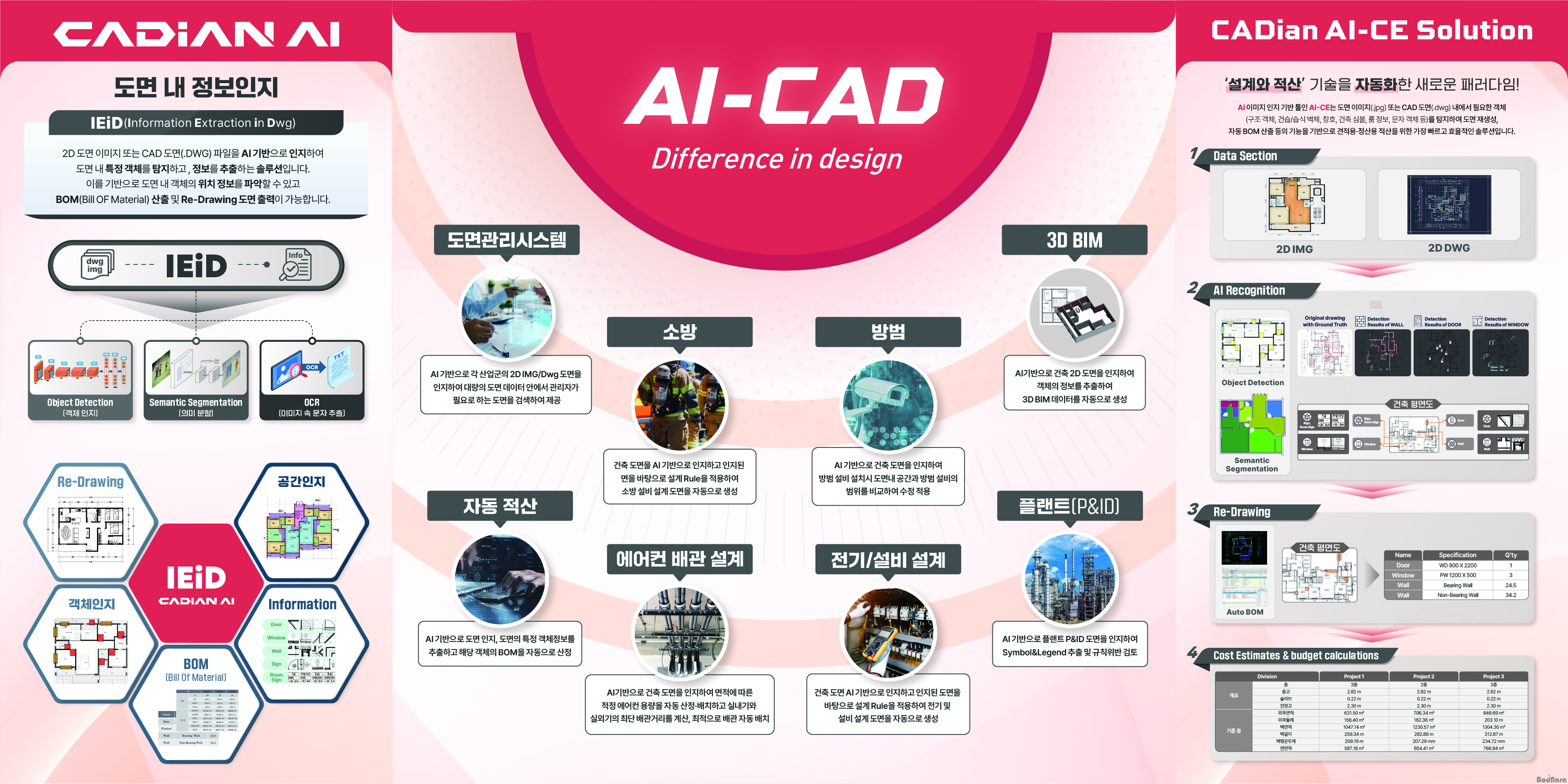 ƯÈ÷ À̹ø Àü½Ã¿¡¼ ijµð¾ÈÀº AI ±â¹Ý ¼³°è ¹× ÀÚµ¿ Àû»ê ±â¼ú ‘AI-CE(AI-Cost Estimation)’ ¼Ö·ç¼ÇÀ» ÇÙ½É Ãâǰ Ç׸ñÀ¸·Î ¼±º¸ÀδÙ. AI-CE´Â À̹ÌÁö (jpg, png) µµ¸é ¶Ç´Â DWG ijµå µµ¸éÀ» AI°¡ °´Ã¼ ÀÎÁö ¹× Ãß·Ð °úÁ¤À» ÅëÇØ ºü¸£°í Á¤È®ÇÏ°Ô ºÐ¼®ÇÏ¿© µµ¸é Àç»ý¼º, ÇÊ¿äÇÑ °´Ã¼ ŽÁö, ÀÚµ¿ BOM (Bill of Material) »êÃâ ÀÛ¾÷±îÁö ¼öÇà °¡´ÉÇÏ´Ù. Àü¹®°¡°¡ µµ¸éÀ» À°¾ÈÀ¸·Î È®ÀÎÇÏ°í ¼öÀÛ¾÷À¸·Î ¹°·® »êÃâÇÏ´ø ±âÁ¸ÀÇ ³ëµ¿ Áý¾àÀû ÇÁ·Î¼¼½º¿¡¼ ¹þ¾î³ª, ½Å¼ÓÇϰí Á¤È®ÇÑ °ßÀû »êÃâÀ» ÅëÇØ °Ç¼³»çÀÇ ÇÁ¸®ÄÜ(Pre-con) ¿ª·®À» ±Ø´ëÈÇÏ°í ¼öÁÖ ¼º°ø·üÀ» ³ôÀÌ´Â ÇÙ½É Àü·« ÀÚ»êÀÌ´Ù.