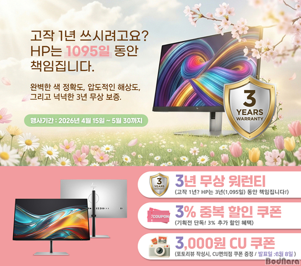À̹ø Çà»çÀÇ Å¸ÀÌÆ²ÀÎ ‘3•3•3’Àº ±¸¸Å °í°´ÀÇ ¸¸Á·µµ¸¦ ±Ø´ëÈÇÏ´Â ¼¼ °¡Áö ÇÙ½É ÇýÅÃÀ» ÀǹÌÇÑ´Ù. °¡Àå ´«¿¡ ¶ç´Â ÇýÅÃÀº ´Ü¿¬ ‘3³â ¹«»ó ¿ö·±Æ¼’ ´Ù. ÀϹÝÀûÀÎ ÄÁ½´¸Ó ¸ð´ÏÅÍ ½ÃÀåÀÇ º¸Áõ ±â°£ÀÌ 1³â¿¡ ºÒ°úÇÑ °Í°ú ´Þ¸®, À̹ø ±âȹÀüÀ» ÅëÇØ ±¸¸ÅÇÑ °í°´Àº ±âº» 1³â º¸Áõ¿¡ 2³âÀ» ´õÇØ “ÃÑ 1,095Àϰ£ HPÀÇ ÃÖ°í ¼öÁØ »çÈÄ ¼ºñ½º(AS)” ¸¦ ¹«»óÀ¸·Î ´©¸± ¼ö ÀÖ´Ù. ÀÌ´Â HP Á¦Ç°ÀÇ ¾ÐµµÀûÀÎ ³»±¸¼º°ú ǰÁú¿¡ ´ëÇÑ °ÇÑ ÀڽۨÀÌ ¹Ý¿µµÈ °á°ú´Ù.