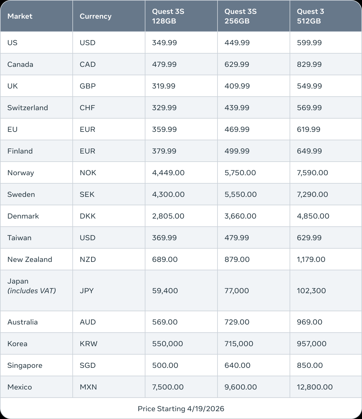 ¸ÞŸ(Meta)°¡ ÀÚ»ç VR Çìµå¼Â ‘Äù½ºÆ®(Quest)’ ½Ã¸®ÁîÀÇ °¡°Ý ÀλóÀ» °ø½Ä ¹ßÇ¥Çß´Ù. ´ë»óÀº ¸ÞÀνºÆ®¸² Á¦Ç°ÀÎ Äù½ºÆ® 3¿Í º¸±ÞÇü ¸ðµ¨ÀÎ Äù½ºÆ® 3S·Î, ÀλóµÈ °¡°ÝÀº 2026³â 4¿ù 19ÀϺÎÅÍ Àû¿ëµÈ´Ù.