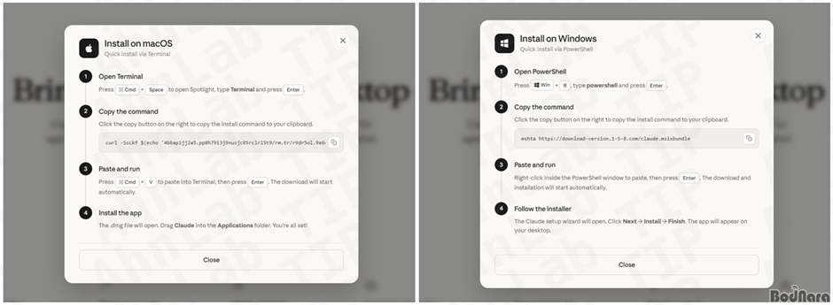 ÇØ´ç »çÀÌÆ®¿¡´Â ‘Bring Claude to your Desktop(Ŭ·Îµå¸¦ µ¥½ºÅ©Åé¿¡¼ ÀÌ¿ëÇØ º¸¼¼¿ä)’À̶ó´Â ¹®±¸¿Í ÇÔ²² À©µµ¿ì, ¸ÆOS µî ¿î¿µÃ¼Á¦(OS) º° ´Ù¿î·Îµå ¹öưÀÌ ¹èÄ¡µÅ ÀÖ´Ù. »ç¿ëÀÚ°¡ ÀÚ½ÅÀÇ OS¿¡ ¸Â´Â ´Ù¿î·Îµå ¹öưÀ» Ŭ¸¯Çϸé, ½ÇÁ¦ ¼³Ä¡ ÆÄÀÏÀÌ ³»·Á ¹Þ¾ÆÁö´Â ´ë½Å ¼³Ä¡ ¹æ¹ýÀ» ¾È³»ÇÏ´Â ÆË¾÷âÀÌ ³ªÅ¸³´Ù(º¸ÃæÀÚ·á 2 ÂüÁ¶). ÀÌ ¾È³»¹®Àº ƯÁ¤ ¸í·É¾î¸¦ º¹»çÇØ PC ³» ½Ã½ºÅÛ¿¡ ºÙ¿© ³ÖÀ¸¸é ´Ù¿î·Îµå°¡ ½ÃÀÛµÈ´Ù°í ¼³¸íÇÑ´Ù. ±×·¯³ª »ç¿ëÀÚ°¡ ÀÌ ÀýÂ÷¸¦ ¼öÇàÇÒ °æ¿ì ¾Ç¼ºÄڵ尡 ¼³Ä¡µÇ¸ç PC ³» ÆÄÀÏ, ºê¶ó¿ìÀú ÀúÀå Á¤º¸, ¾ÏÈ£ÈÆó Áö°© Á¤º¸ µîÀ» Å»ÃëÇØ °ø°ÝÀÚÀÇ ¼¹ö·Î Àü¼ÛÇÑ´Ù.