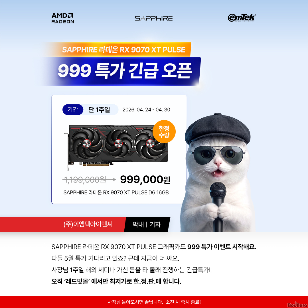 À̹ø Ư°¡´Â ¿ÀÁ÷ ¢ßÀÌ¿¥ÅؾÆÀÌ¿£¾¾ °ø½Ä ¿Â¶óÀÎ ¼îÇθô ·¹µåºø¸ô¿¡¼¸¸ ´Üµ¶À¸·Î ÁøÇàµÇ¸ç, À̺¥Æ® ±â°£Àº 2026³â 4¿ù 24ÀϺÎÅÍ 4¿ù 30ÀϱîÁö ´Ü 1ÁÖÀÏÀÌ´Ù. Á¤»ó°¡ 1,199,000¿øÀÇ 'SAPPHIRE ¶óµ¥¿Â RX 9070 XT PULSE D6 16GB'¸¦ 999,000¿ø¿¡ ±¸¸ÅÇÒ ¼ö ÀÖÀ¸¸ç, ¼±Âø¼ø ÇÑÁ¤ ¼ö·®À¸·Î ¿î¿µµÇ¾î ÁغñµÈ ¼ö·® ¼ÒÁø ½Ã º°µµ °øÁö ¾øÀÌ Áï½Ã Á¾·áµÈ´Ù.