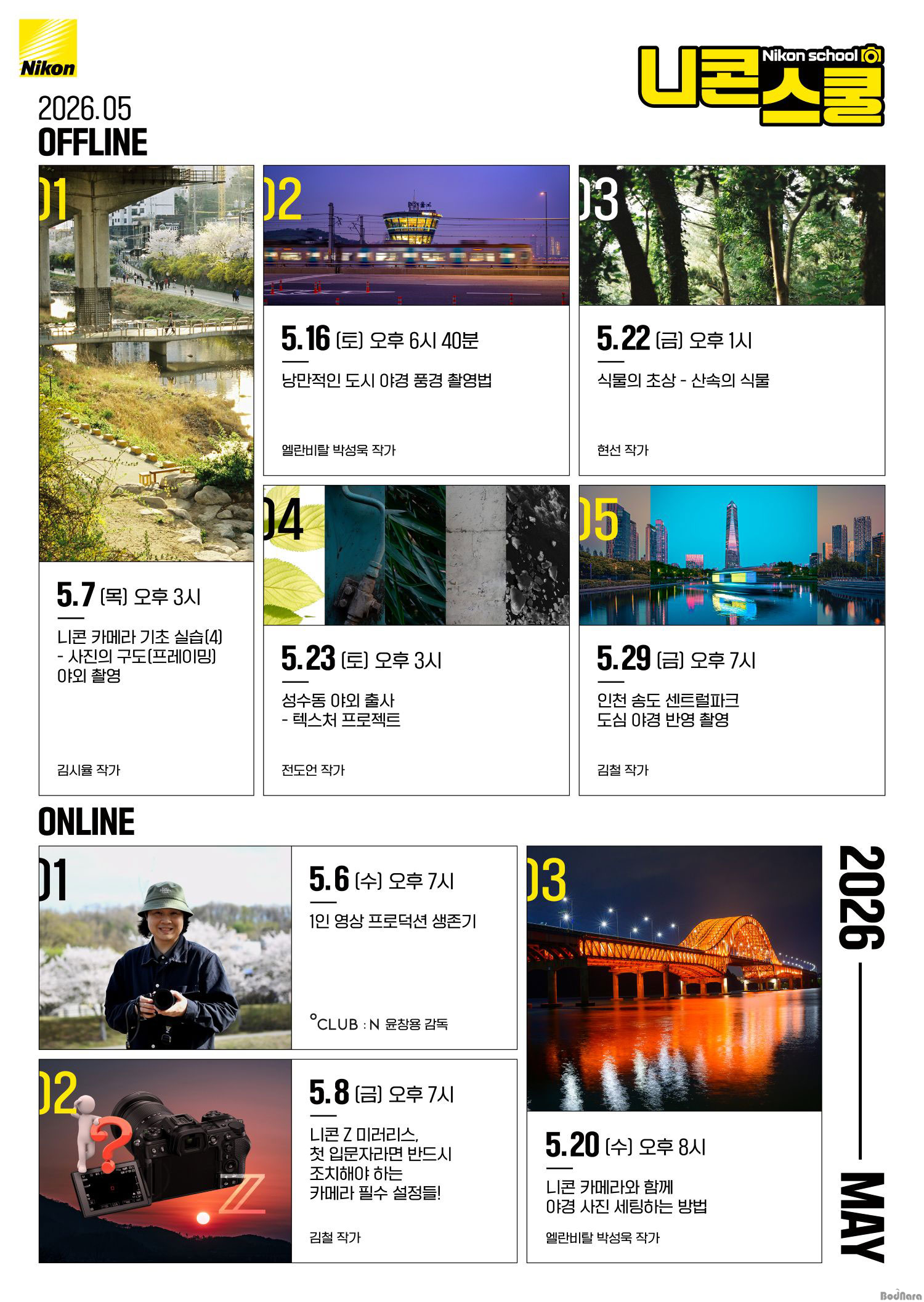 ÃÑ 5°³ÀÇ °úÁ¤À¸·Î ±¸¼ºµÈ ¿ÀÇÁ¶óÀÎ °ÀÇ´Â 5¿ù 7ÀÏ ‘´ÏÄÜ Ä«¸Þ¶ó ±âÃÊ ½Ç½À(4) – »çÁøÀÇ ±¸µµ(ÇÁ·¹À̹Ö)’À¸·Î ½ÃÀ۵ȴÙ. Ä«¸Þ¶óÀÇ ±âº»±â¸¦ ¼¼¼¼ÇÏ°Ô ´Ù·ç´Â ÇØ´ç °Á¿¡¼´Â ¼ö°»ýµéÀÌ Á÷Á¢ »çÁø ±¸µµ¸¦ Àâ¾Æº¸¸ç ´Ù¾çÇÑ ¾ß¿Ü ÃÔ¿µÀ» ÁøÇàÇÒ ¿¹Á¤ÀÌ´Ù. 16ÀÏ ‘³¶¸¸ÀûÀÎ µµ½Ã ¾ß°æ ÃÔ¿µ¹ý’¿¡¼´Â ¿òÁ÷ÀÌ´Â ÇÇ»çü¸¦ µû¶ó ÃÔ¿µÇÏ´Â ÆÐ´×¼¦ ½Ç½À°ú ÇÔ²² µµ½ÃÀÇ ºûÀÇ È帧À» ´ã´Â ¾ß°£ »çÁø ÃÔ¿µ¹ýÀ» ¾È³»ÇÑ´Ù.