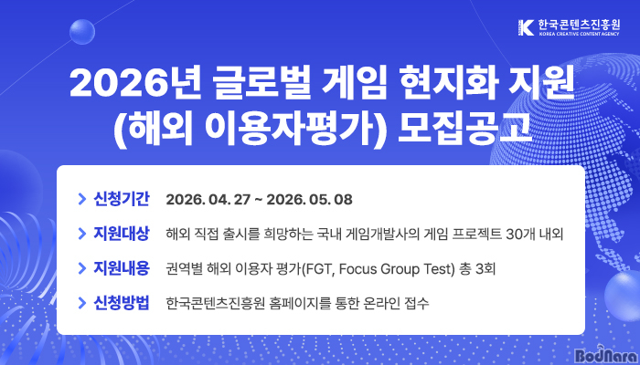 ¹®ÈüÀ°°ü±¤ºÎ(Àå°ü ÃÖÈÖ¿µ)¿Í Çѱ¹ÄÜÅÙÃ÷ÁøÈï¿ø(¿øÀåÁ÷¹«´ëÇà À¯Çö¼®, ÀÌÇÏ ÄÜÁø¿ø)Àº ±¹»ê °ÔÀÓÀÇ ±Û·Î¹ú ÁøÃâ °æÀï·Â °È¸¦ À§ÇØ ‘2026³â ±Û·Î¹ú °ÔÀÓ ÇöÁöÈ Áö¿ø(ÇØ¿Ü ÀÌ¿ëÀÚÆò°¡)’ »ç¾÷ Âü°¡ ÇÁ·ÎÁ§Æ®¸¦ ¿À´Â 4¿ù 27ÀϺÎÅÍ 5¿ù 8ÀϱîÁö ¸ðÁýÇÑ´Ù°í ¹àÇû´Ù.