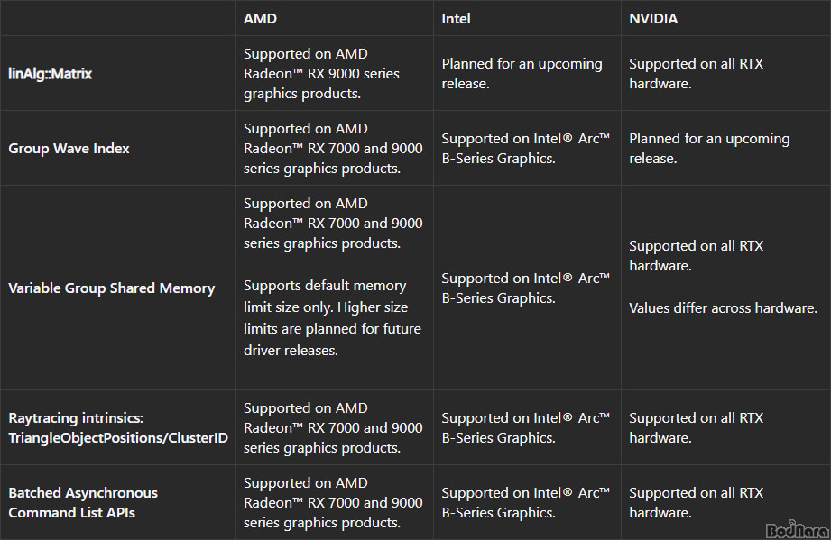 Shader Model 6.10ÀÇ ½Å±Ô ±â´ÉÀº ±âº»ÀûÀ¸·Î AMDÀÇ °æ¿ì ¶óµ¥¿Â RX 7000 ½Ã¸®Áî ÀÌ»ó, ÀÎÅÚ ¾ÆÅ© B ½Ã¸®Áî ÀÌ»ó, ¿£ºñµð¾Æ´Â ¸ðµç RTX ½Ã¸®Áî¿¡¼ Áö¿øÇÏÁö¸¸, ¾ÆÁ÷Àº ÀϺΠÁ¦ÇѵǴ °æ¿ìµµ ÀÖ´Ù.