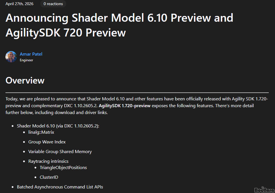 DirectX 12¿ë Agility SDK 1.720 ÇÁ¸®ºä ÇüÅ·Π°ø°³µÈ Shader Model 6.10Àº º°µµÀÇ À©µµ¿ì ¾÷µ¥ÀÌÆ® ¾øÀ̵µ Ãֽбâ´ÉÀ» Àû¿ëÇÒ ¼ö ÀÖ´Â ±¸Á¶¸¦ À¯ÁöÇϸç, Å©°Ô ¼¼ °¡Áö ÇÙ½É º¯È¸¦ Ãß±¸ÇÑ´Ù.